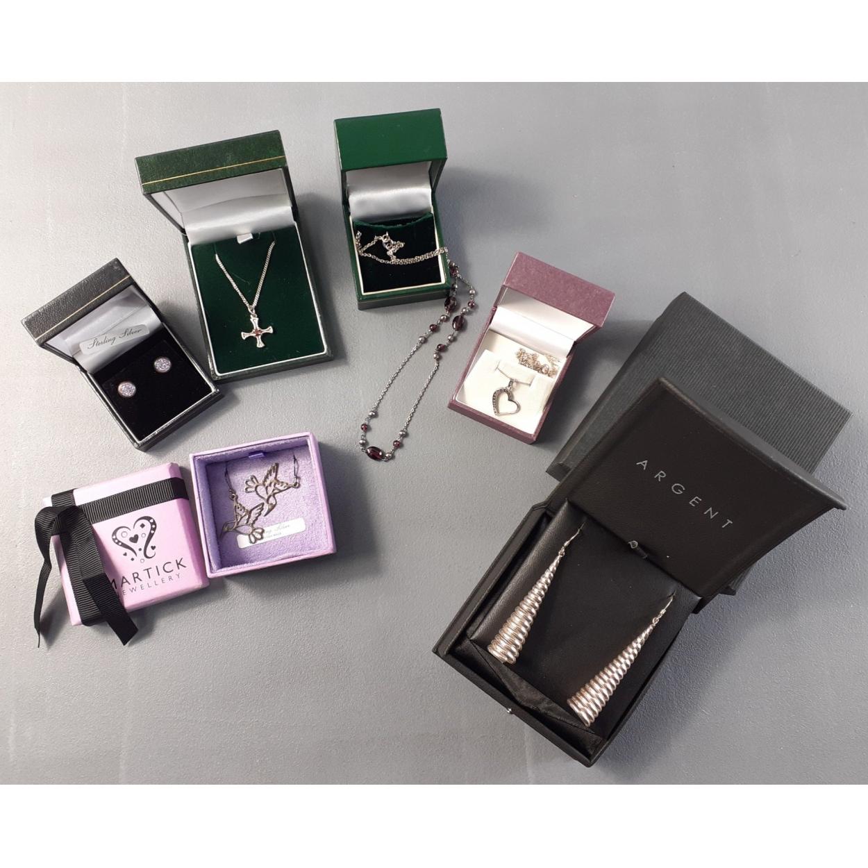 A collection of silver jewellery to include a cross set with small red stone, an open heart set with clear stones, a pair of hoop bird shaped earrings, a pair of sparkly stud earrings, and an impressive pair of hoop cone shaped earrings approx 60mm long etc. All boxed in excellent condition.