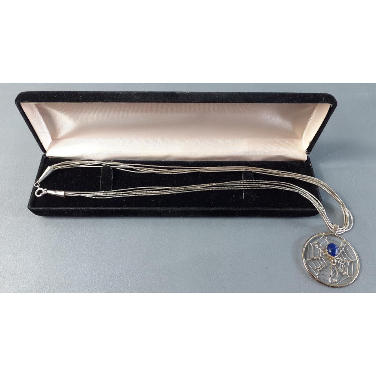 SPIDERS WEB - A fabulous 925 stamped spider's web with blue stone body pendant and unusual multi-stranded necklace still in its jeweller's presentation box, gross weight 16.5g approx