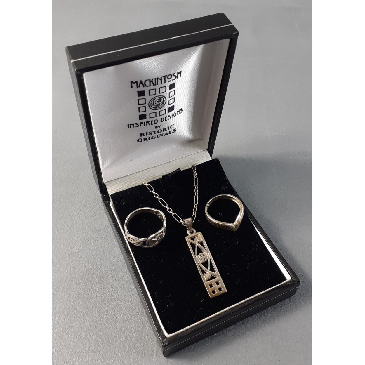 A 925 stamped RENNIE MACKINTOSH design pendant on chain, a 925 wishbone ring size I/J and a white metal Celtic knot ring size K/L - silver weight 7.70g approx