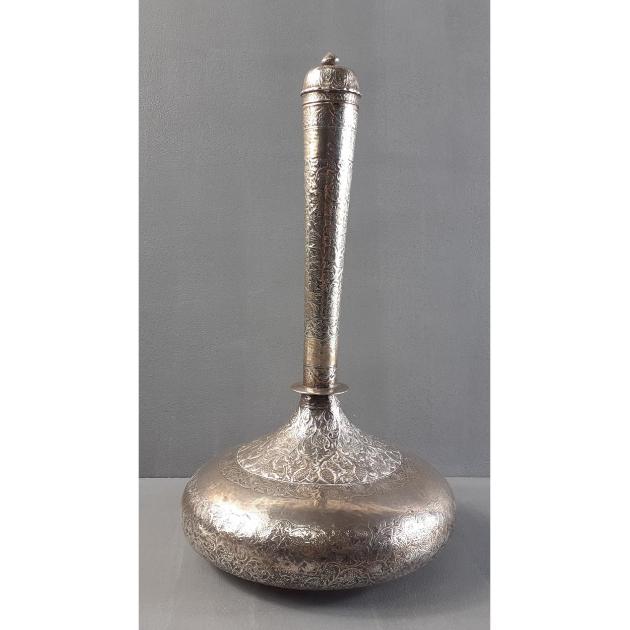 An Indian or Mughal SURAHI water or wine flask in white metal. Nicely decorated and in good condition with only very minor dents noted. 27cm tall approx.