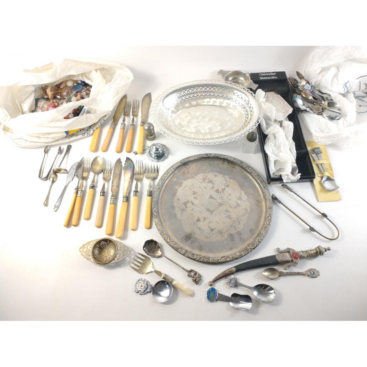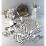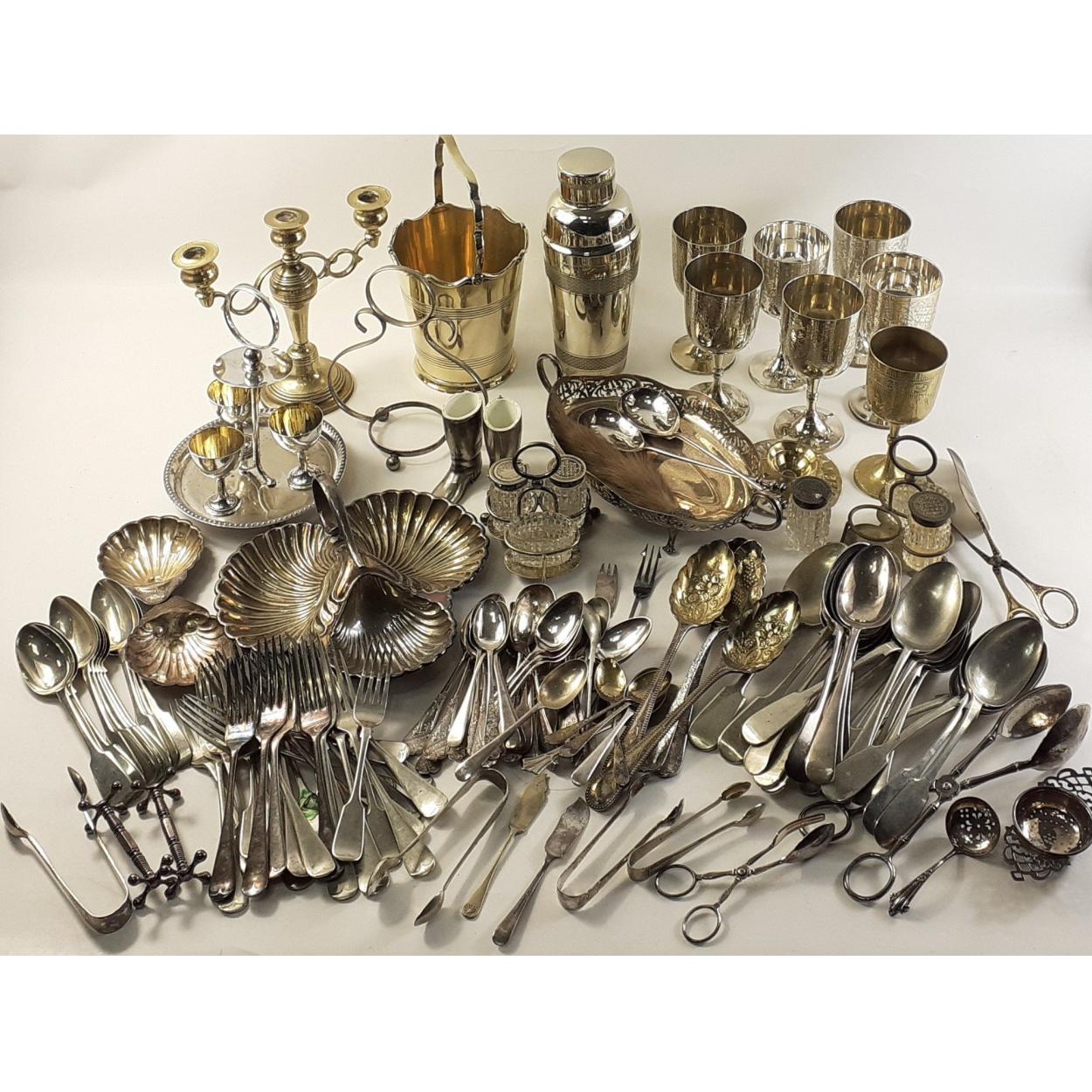 A box of silver plates and metal table ware to include many spoons, forks, other cutlery, condiments, trays, candlestick, ice bucket cocktail shaker, goblets and others.