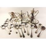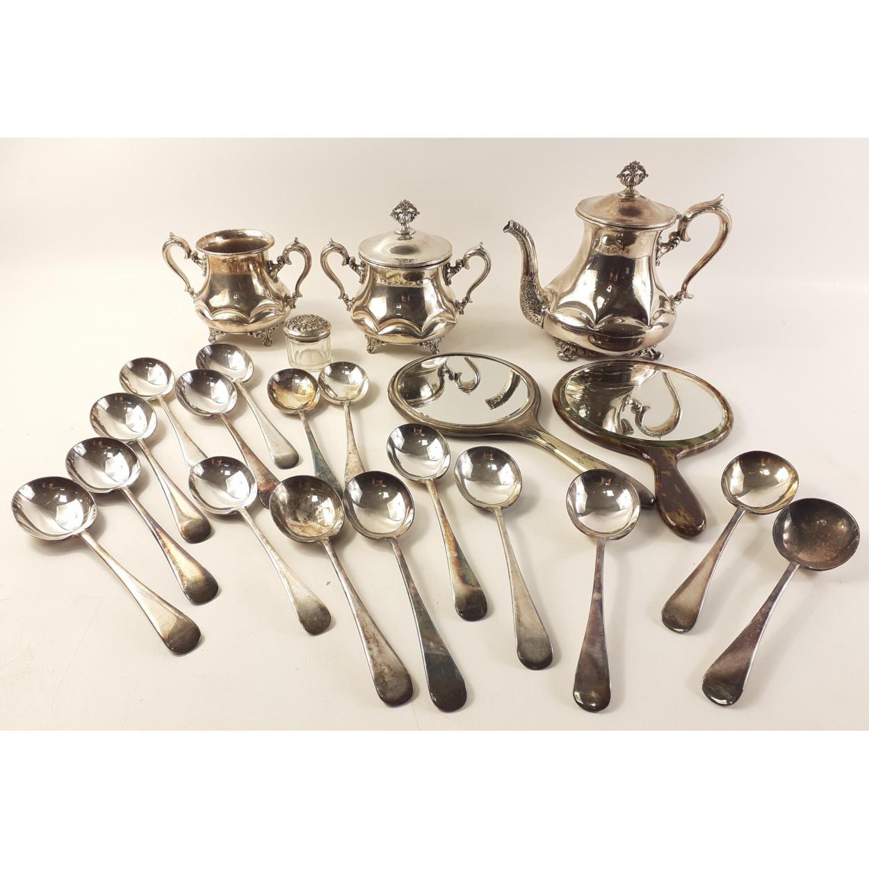 A small silver plate lot to include a tea service by WEBB, soup spoons, hand mirror plus a silver hallmarked bottle.