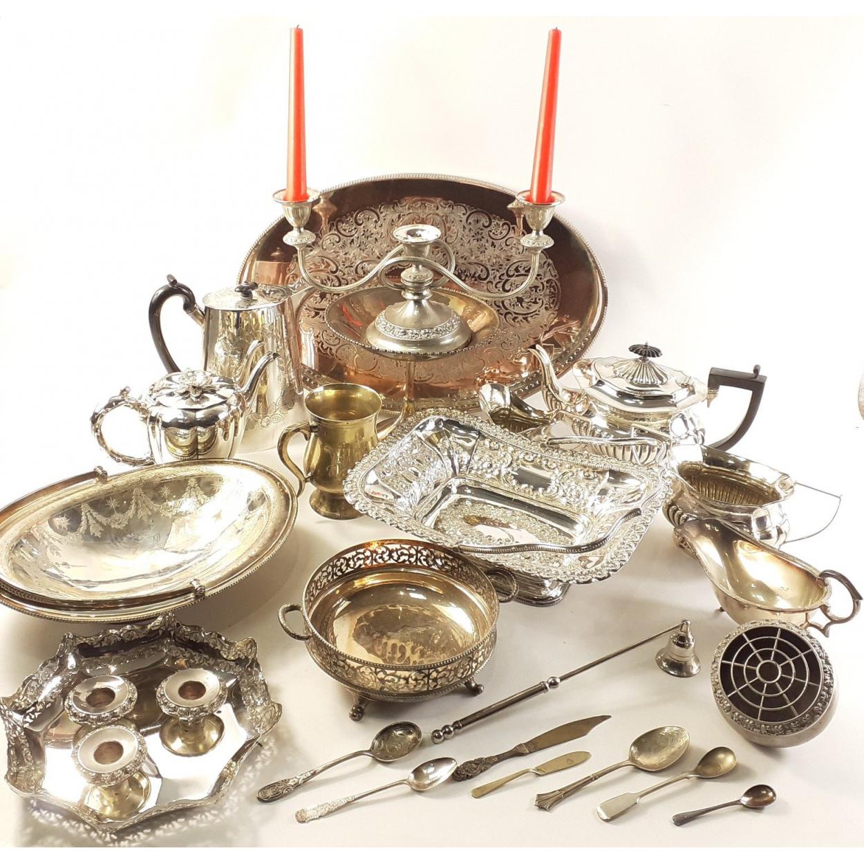 A box of silver plated items, gallery tray, teapot, coffee boat, gravy boat, pretty fruit bowl, candelabra and much else.