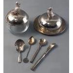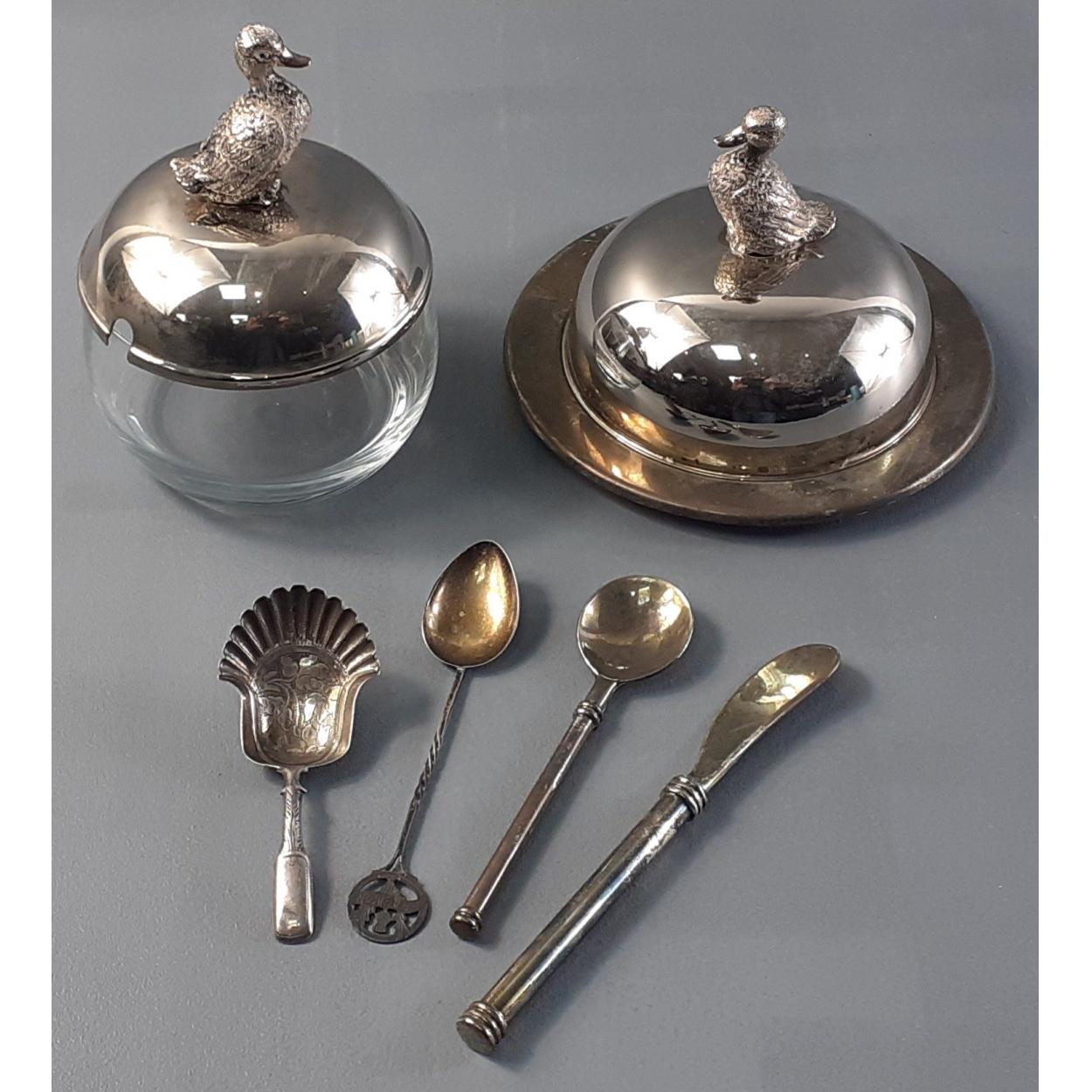 A wee THISTLE SILVER teaspoon with a confiture spoon hallmarked silver weight combined 15.8g approx - with two table plated DUCK finials lidded conserve lidded dish with spoon 10cm height x 14cm diameter approx and a matching lidded butter dish