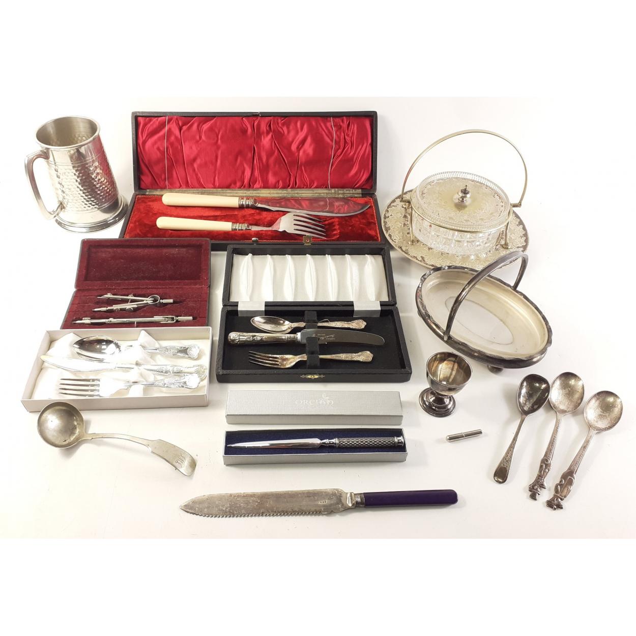 A collection of silver plate to include Victorian serving dish, boxed cutlery, tankard, mixed cutlery etc. An interesting lot of silver plate
