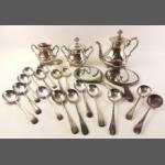 A small silver plate lot to include a tea service by WEBB, soup spoons, hand mirror plus a silver hallmarked bottle.