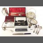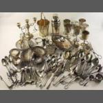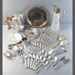 A box of silver plates and metal table ware to include many spoons, forks, other cutlery, condiments, trays, candlestick, ice bucket cocktail shaker, goblets and others.