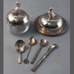 A wee THISTLE SILVER teaspoon with a confiture spoon hallmarked silver weight combined 15.8g approx - with two table plated DUCK finials lidded conserve lidded dish with spoon 10cm height x 14cm diameter approx and a matching lidded butter dish