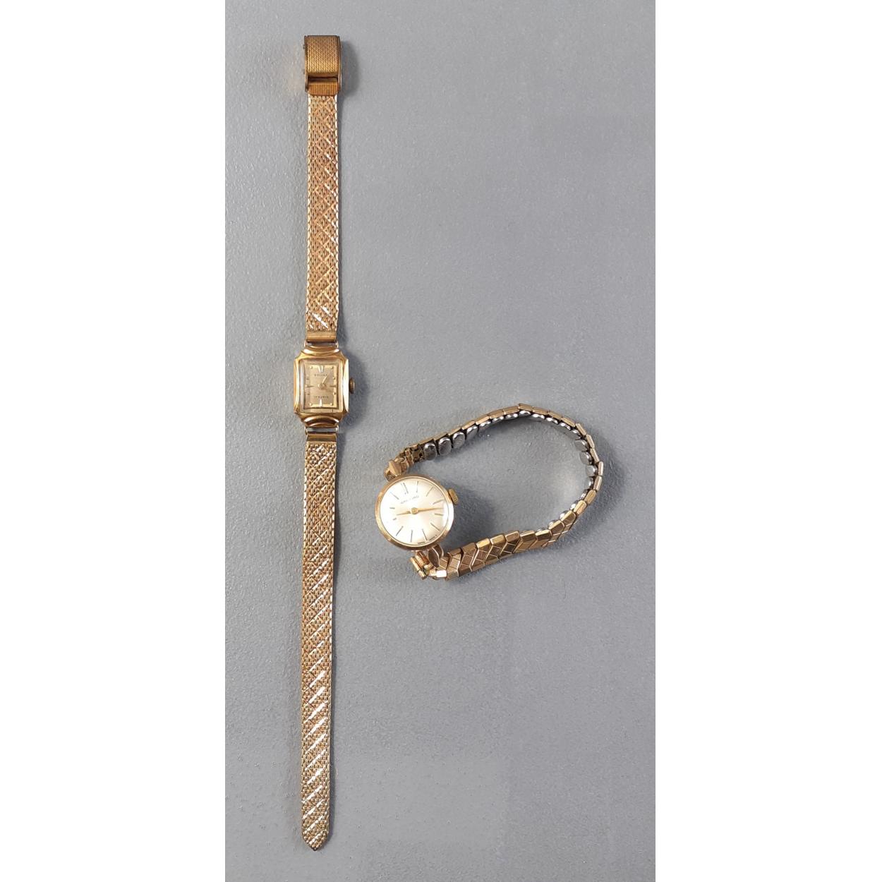 Two vintage cocktail watches. One case top stamped 585. The circular one Garrard case stamped 375. Straps not gold.