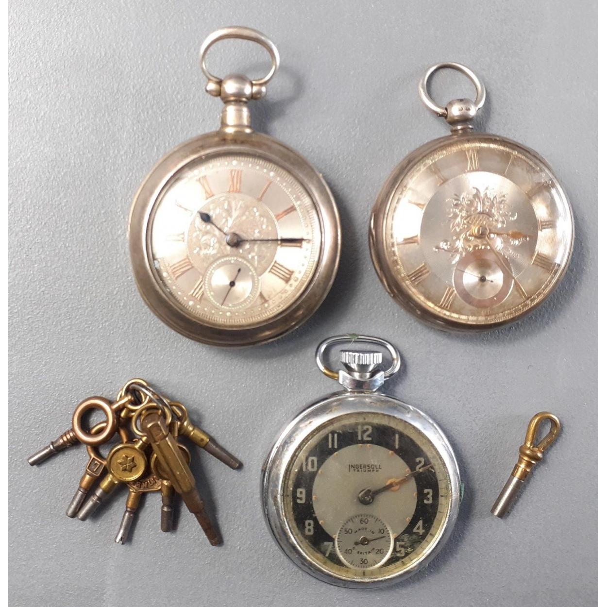 Two pocket watches c1870/80 in white metal with a SILVER hallmarked pocket watch with an outer case also hallmarked - gross weight 146g for this watch - watch was ticking away quite happily on valuation with an Ingersoll pocket watch (also ticking away quite happily on valuation) with a set of mixed watch keys