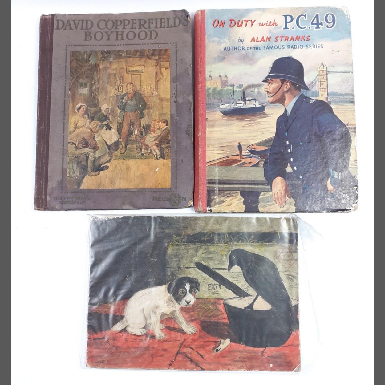 DAVID COPPERFIELD'S BOYHOOD by Charles Dickens, abridged by Edward Shirley, published by Thomas Nelson, dedicated to 'Irene' Xmas 1917, with colour plates in fair condition and a copy of ON DUTY WITH PC 49 by Alan Stranks author of "the famous radio series" with some colour plates and scribbling in ink and a watercolour on card of a small dog and crow 1921.