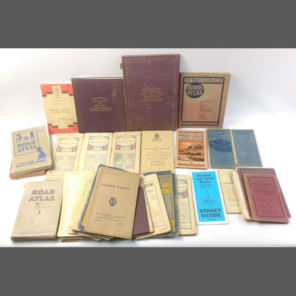 A collection of maps to include BACONS new survey of South Scotland, BACONS Survey Map of Central Scotland, various other Michelin and AA travel maps. An interesting lot.