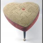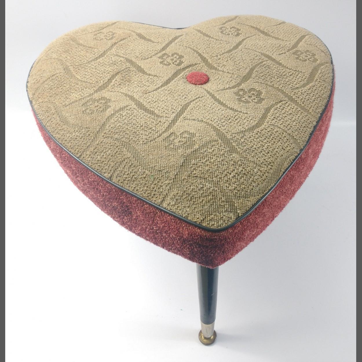 A vintage heart-shaped stool in red and beige boucle material on 3 legs, stands approx 32cm high and 45 cm at widest point