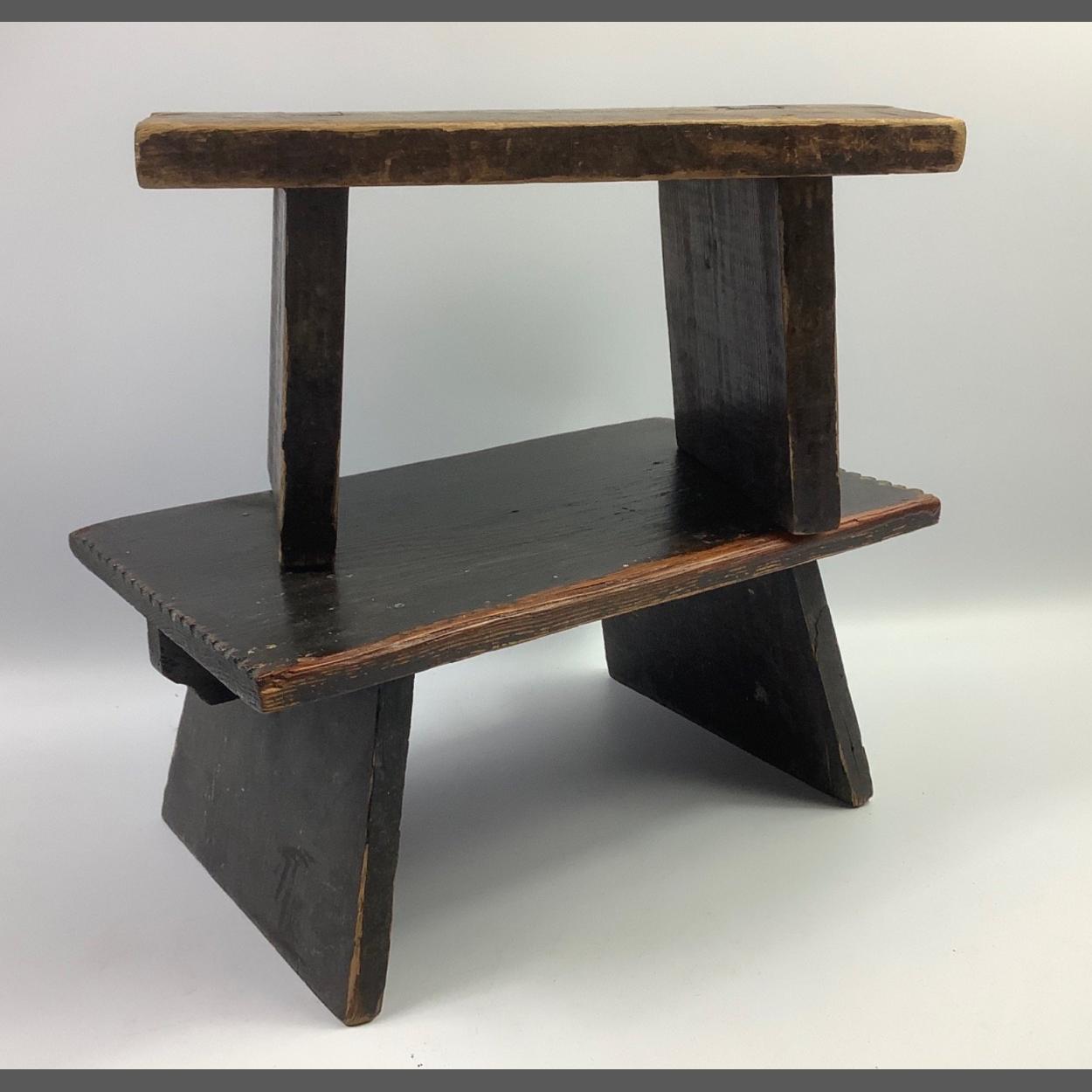 ANTIQUE - Two wooden milking stools with a fantastic patina, the smaller measures 30x17x16cm approx, the larger 33x19x15cm approx, would make attractive plant stands