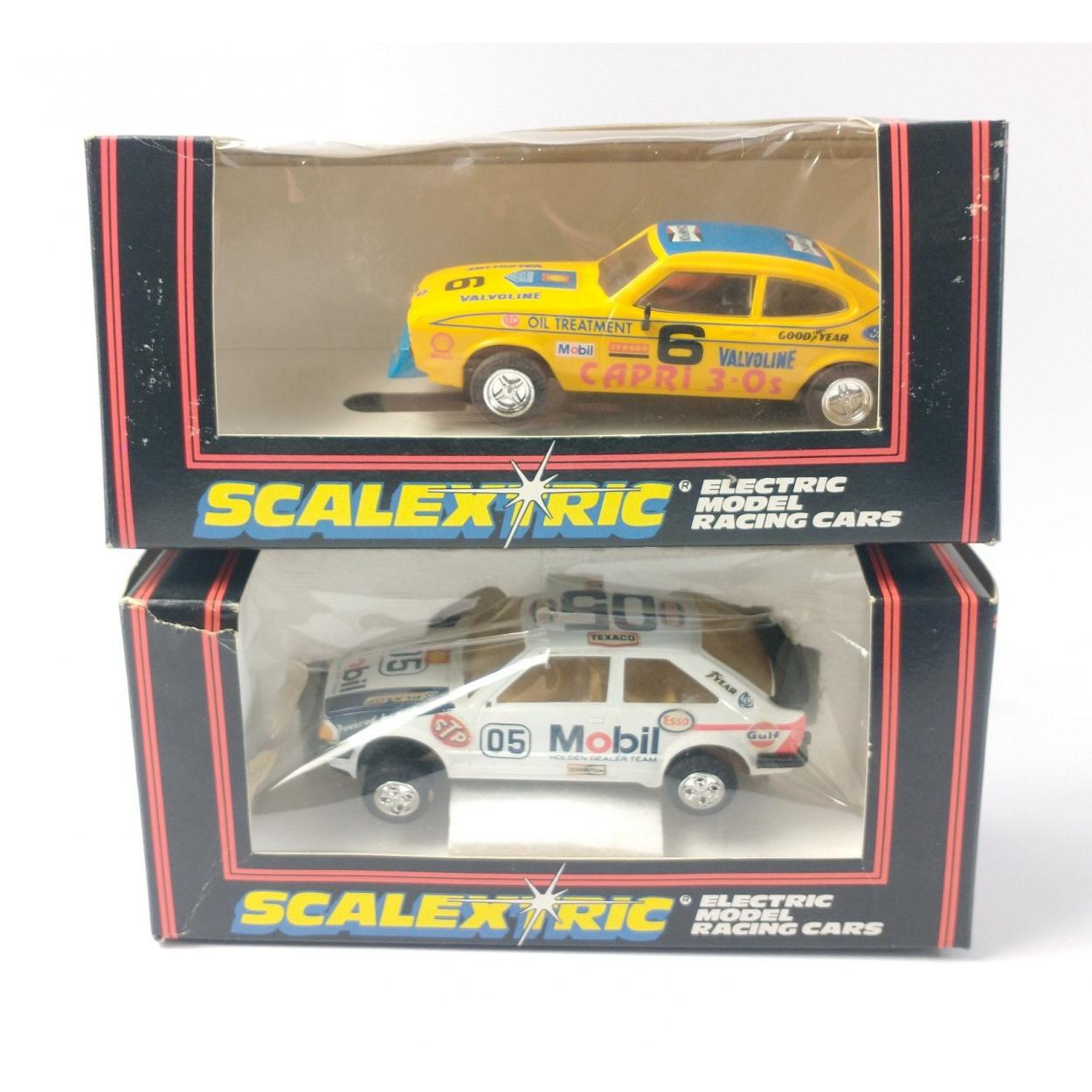 SCALEXTRIC Hornby Hobbies Made in England. Two boxed cars, C.379 Ford Capri 3.0s and C.376 Ford Mobil XR3i. Damage to plastic cover on box otherwise models seem in good order.