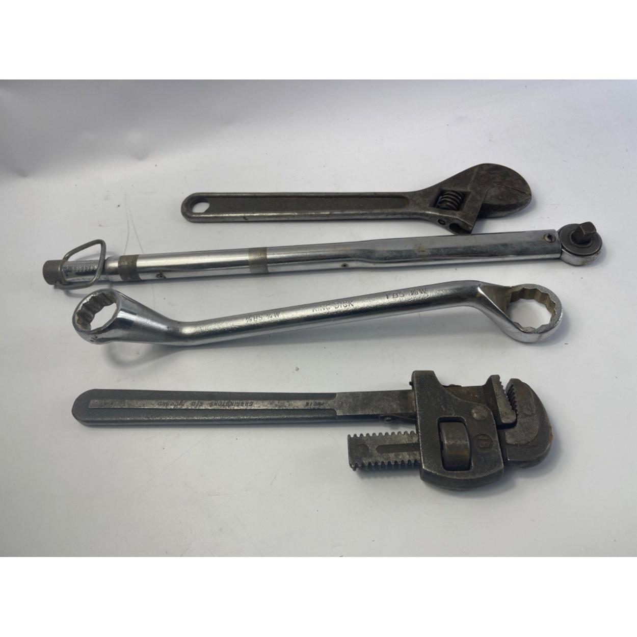 A mixed box of tools to include a torque wrench, two adjustable wrenches, a King Dick 1BS 7/8W large ring spanner