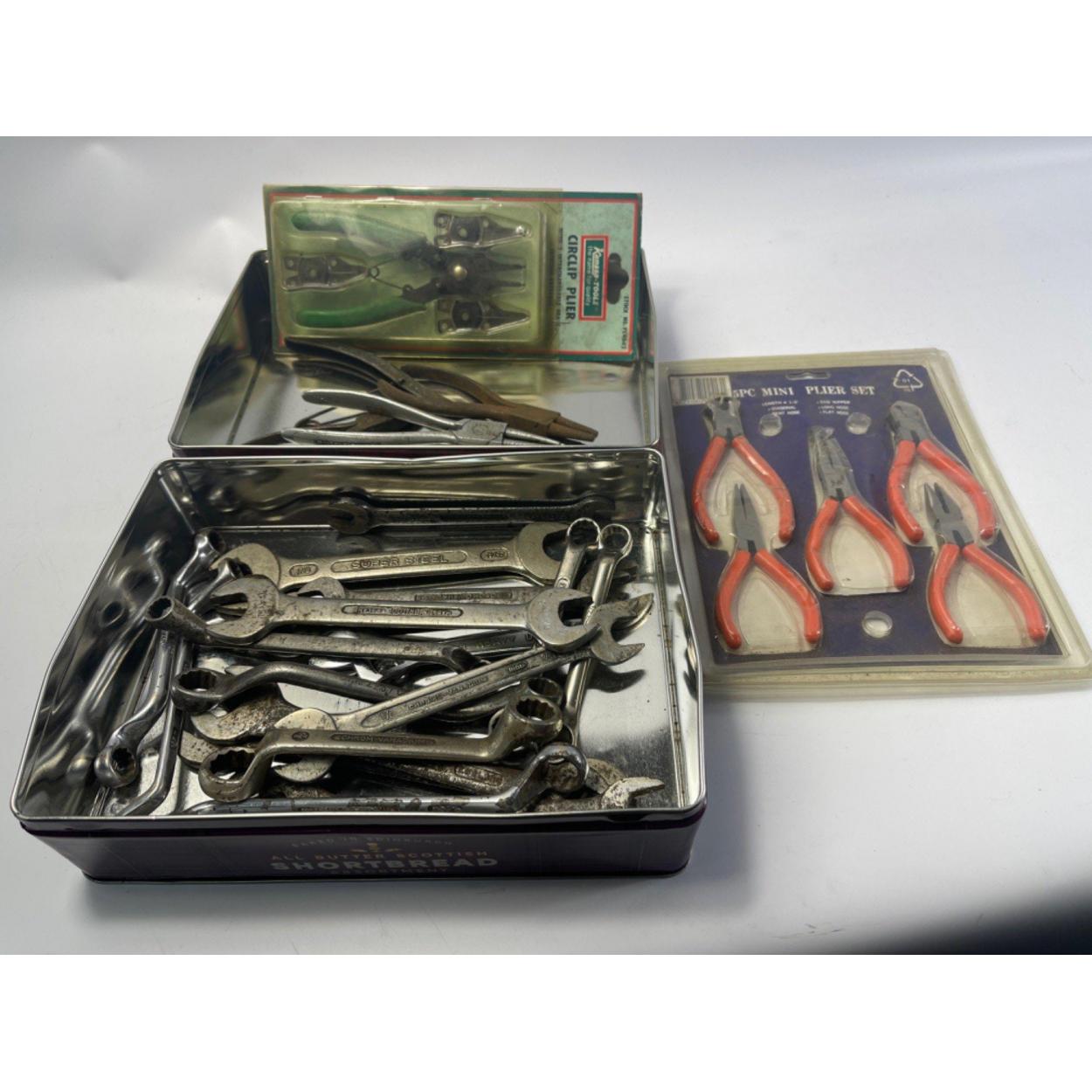 5 circlet pliers and a box of various sized heavy duty spanners, mostly imperial