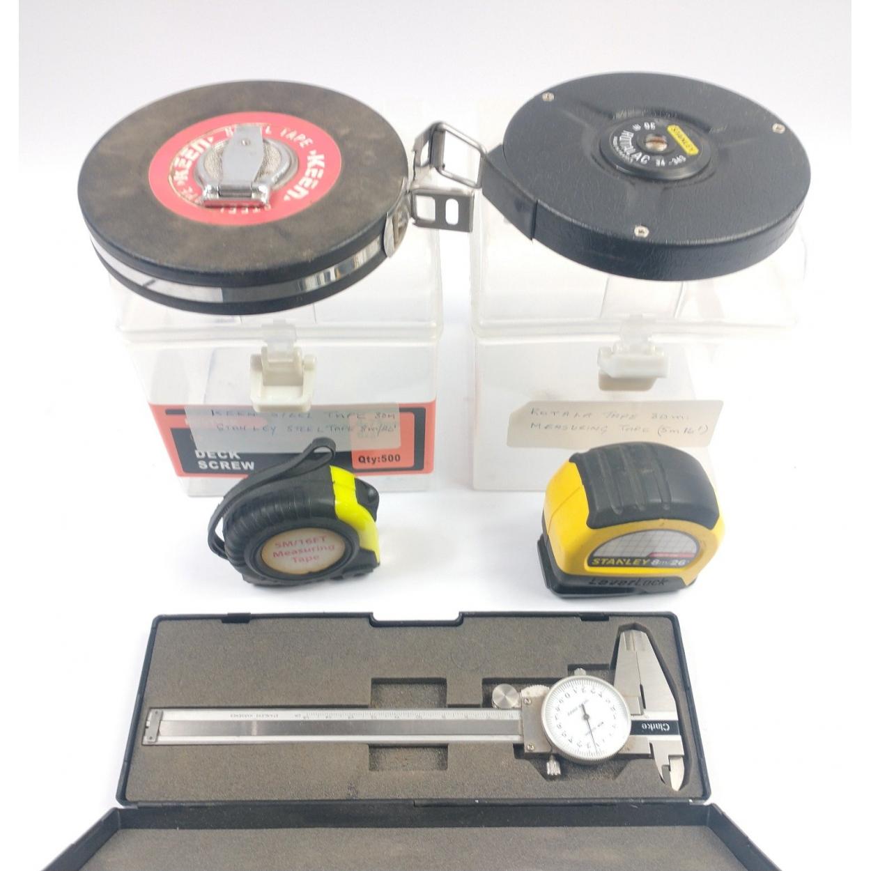 A selection of measuring tapes to include a Stanley ROTOLAC 30m, a KEEN 30m steel tape, a 5m/16' tape and a Stanley 8m/26' tape and a CLARKE precision 150mm dial caliper