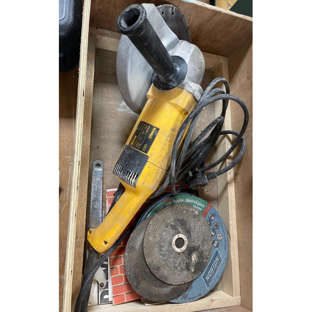 A De Walt electric angle grinder (DW496) with approx 12 spare discs
