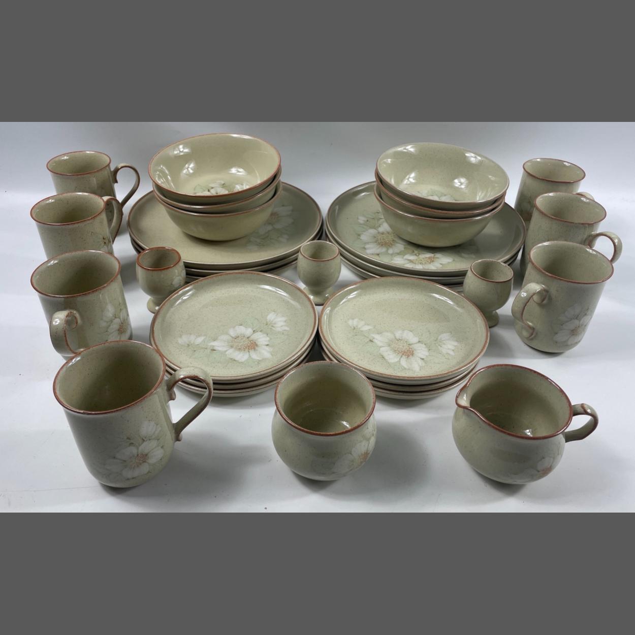 A real vintage DENBY dinner service in the 1970's RONDO pattern comprising 6 plates (26cm), 6 plates (19cm), 6 bowls 19cm), 6 bowls (16cm), 6 saucers (15cm), 6 cups plus 1 milk jug, 1 sugar bowl and 1 each of salt and pepper