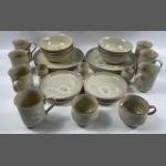 A ROYAL DOULTON FAIRFAX dinner service to include 12 plates (27cm), 12 plates (20cm), 12 bowls (13.5cm), 12 bowls (17cm), 10 saucers (13cm), 5 saucers (15cm), 8 saucers (15.5cm), 12 large coffee/capuccino cups (10cm dia), 12 small cips (7cm), 2 sauceboats with underplates, 1 milk jug (13cm approx), 1 creamer (10cm approx), 1 sugar bowl (11cm), 1 sugar bowl (9cm),