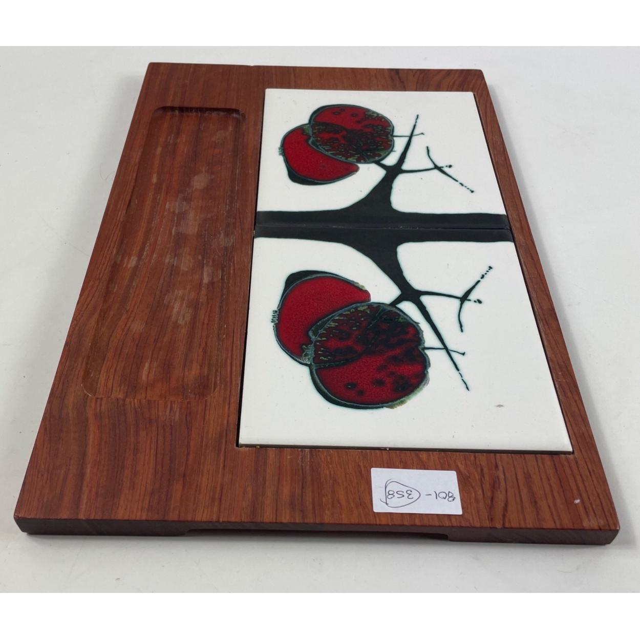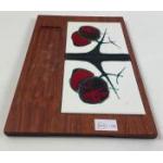 A wooden CHEESEBOARD with 2 pomegranate- decorated tiles and scooped out space for knives etc 38cm x 26cm