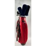 A GOLF BAG to include 4 woods, a putter, 8 irons, mixed named clubs SLAZENGER DUNLOP and a towel