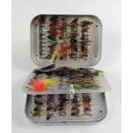 An aluminium FLY BOX - 4 leaf, well-filled with trout and salmon flies