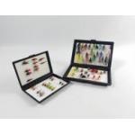 A black FLY BOX around 30 mainly double-hooked salmon flies plus another small flybox of 25 flies and nymphs