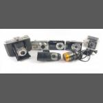 A mixed camera lot to include an OLYMPUS AF-10 MINI camera in case with instruction leaflet, an OLYMPUS AZ-300 super zoom with Olympus lens zoom 38-105mm 1:4, 5-6 and instructions and carry case, an AGFA SILETTE 35mm camera in leather case, a ROLLEI 121BC flash, a NATIONAL Hyper BII flash gun in original case, a WESTON Master V light meter in leather case, an unused SERVICE camera neck strap,