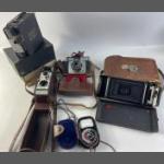 A collection of vintage cameras to include A KODAK Brownie 127, a KODAK ColorSnap 35, a POLAROID SX-70 land camera model 2 (poor condition) in a leather carrying case, and a KODAK no 2 Folding Autographic Brownie camera in a canvas case