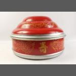 A VERY LARGE CHINESE red-painted round aluminium food storage container with lid - dimensions 40cm diameter x 28cm height - A WHOPPER!