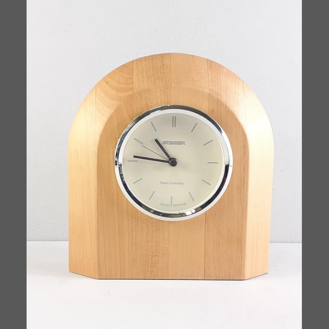 A modern STAIGER radio controlled mantle clock. Stands 18cm approx with a 8cm dial. Battery required.