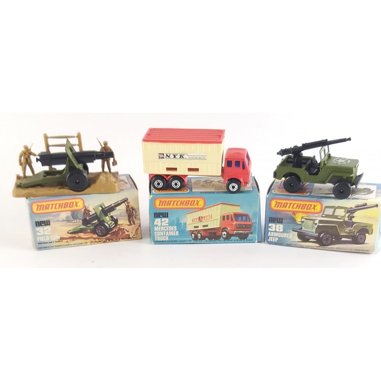 MATCHBOX Diecast x 3. 32 Field Gun, 42 Mercedes Container truck, 38 Armoured Jeep. All boxed good condition.