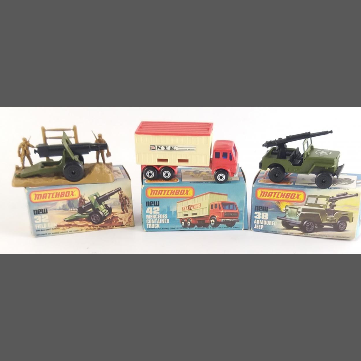 MATCHBOX Diecast x 3. 32 Field Gun, 42 Mercedes Container truck, 38 Armoured Jeep. All boxed good condition.