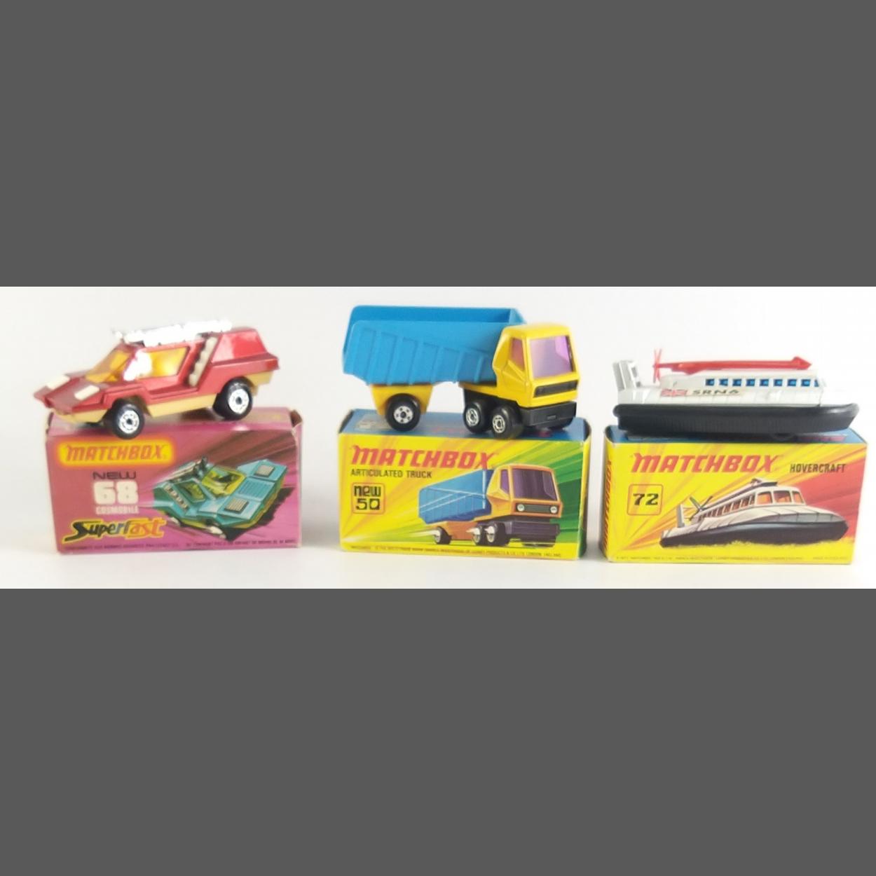 MATCHBOX Diecast x 3. 72 Hovercraft. 50 Articulated Truck, 68 Cosmobile. All boxed good condition.