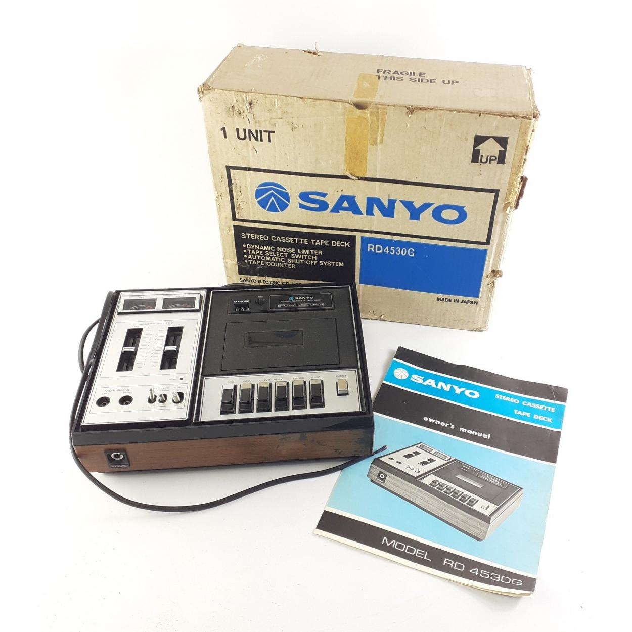 A SANYO stereo cassette tape deck model RD4530G. Amazingly in box with instructions
