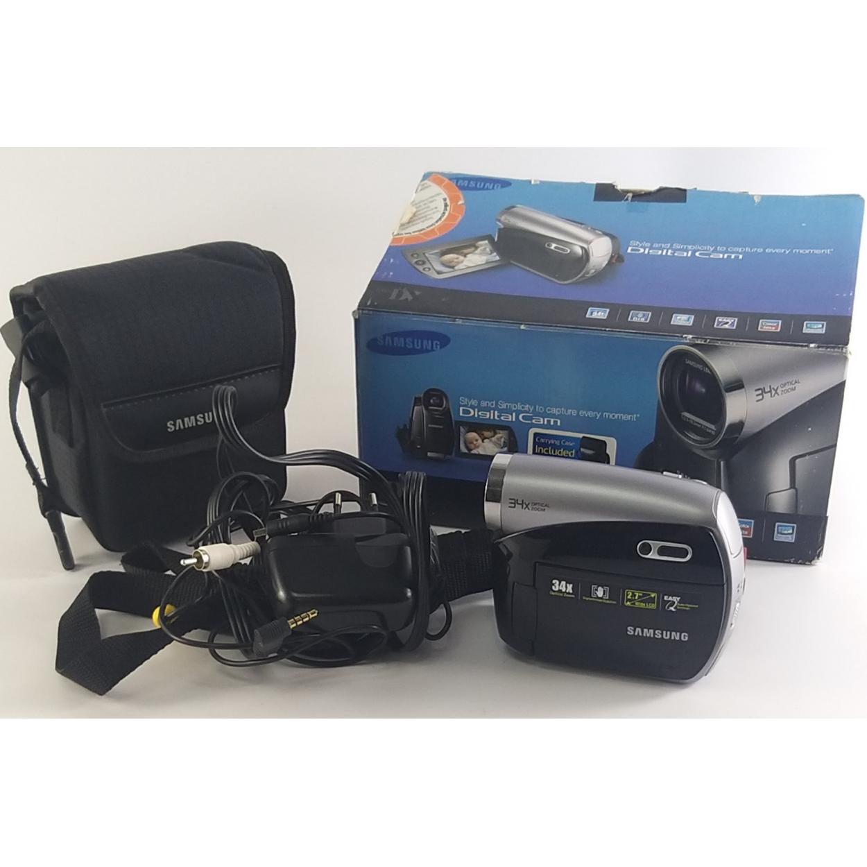 A boxed SAMSUNG VP- D381camcorder with accessories.