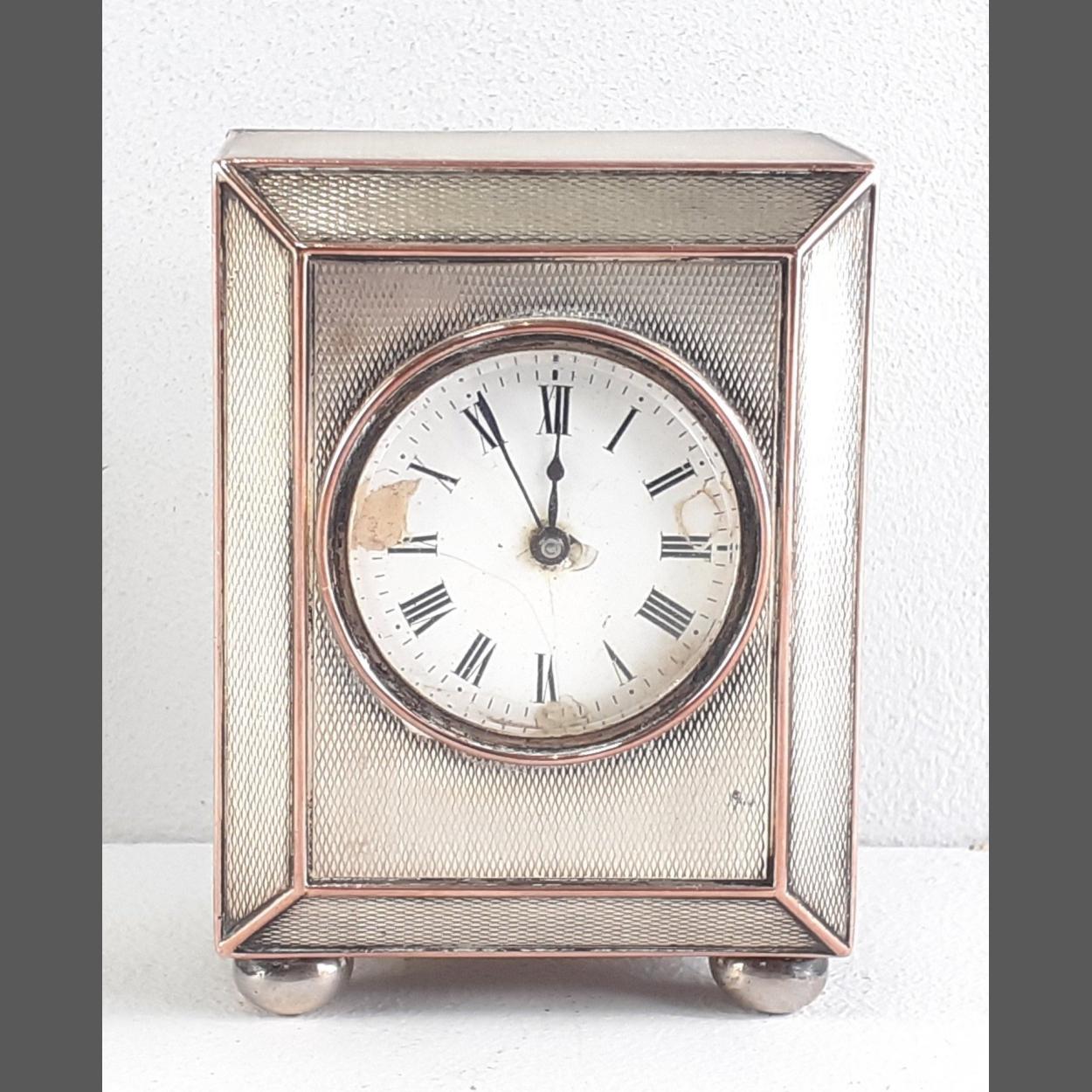 A simply stunning CHESTER hallmarked sterling silver folding travel clock. Hallmarks for 1922. Maker Cohen & Charles. 6cm folded. Gross weight 140g approx. All components carry silver marks. The clock winds and keeps time well, engine turned body in great undamaged condition. A truly lovely piece.