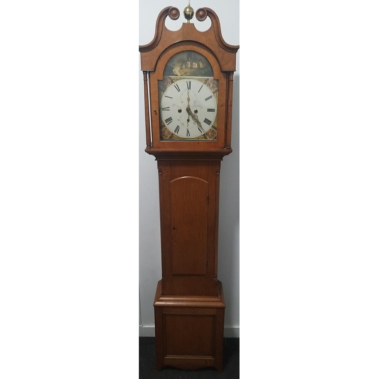 An ARCHIBALD BELL of MELROSE SCOTTISH longcase clock. Painted Dial measures 26cm approx and stands approx 217cm to finial. Comes with weights. Rather nice example of Scottish provincial longcase clocks.