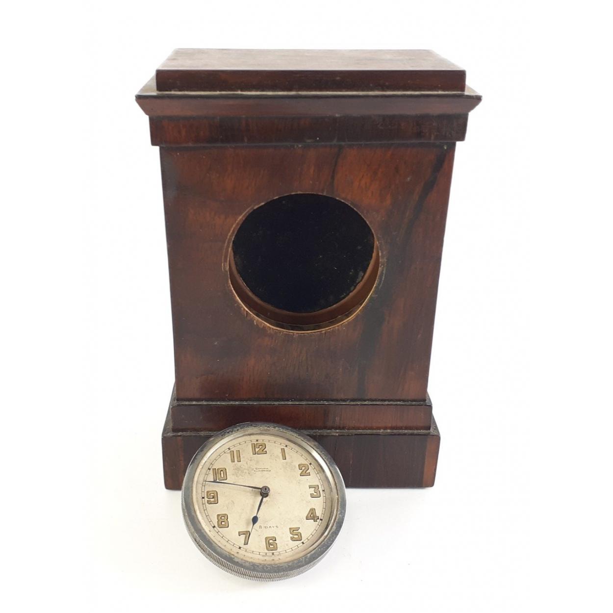 WALKER & HALL inlaid wooden mantle clock. 26cm across at the base. French brass movement, note inside saying 'wedding gift 1926, overhauled 1990'. A very pretty quality piece.