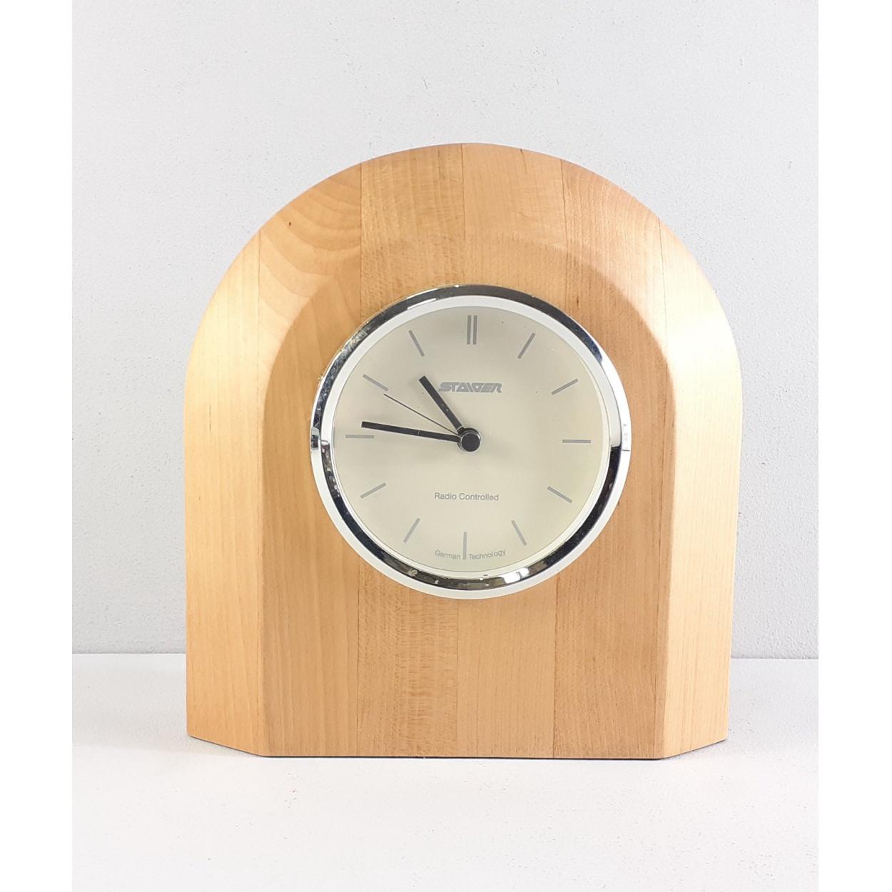 A modern STAIGER radio controlled mantle clock. Stands 18cm approx with a 8cm dial. Battery required.