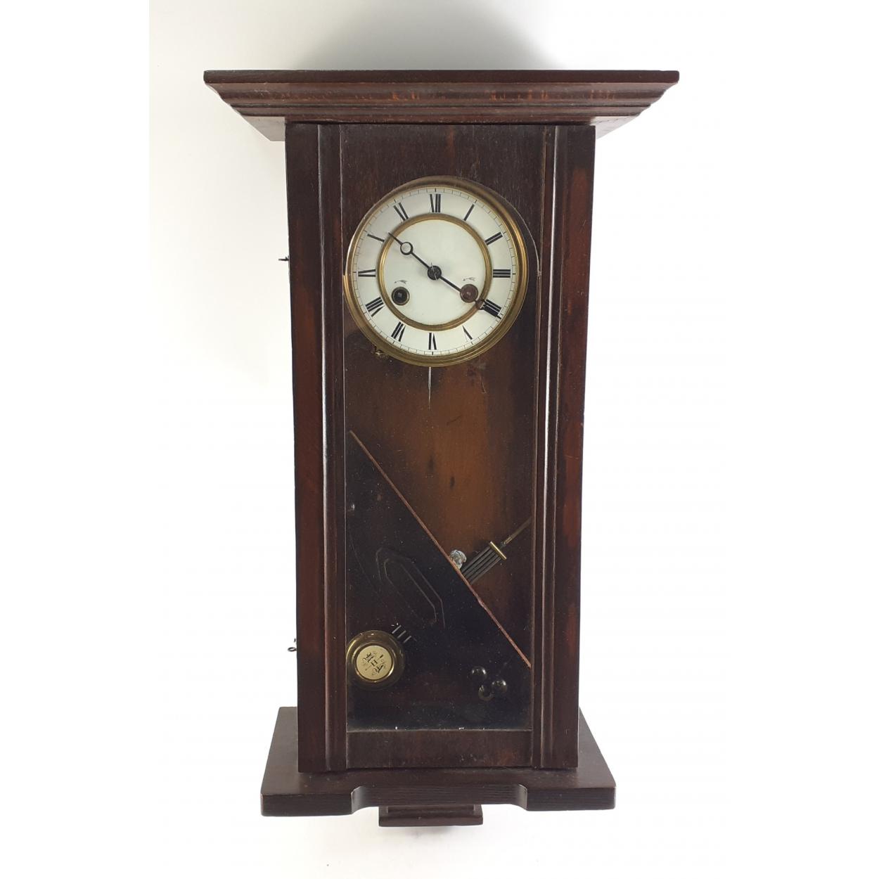 Vintage wooden wall clock with enamel face. Slight damage to glass side panel. With pendulum and key. Approx 67cm tall .