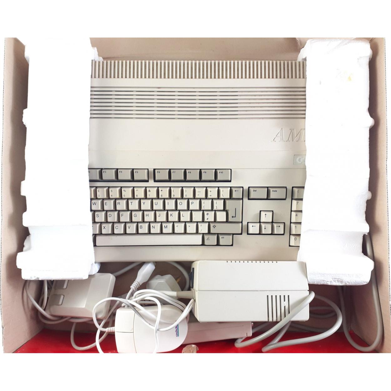 A boxed COMMODORE AMIGA A-500+ in its original box with power leads, various connectors and 2 mice. Untested.
