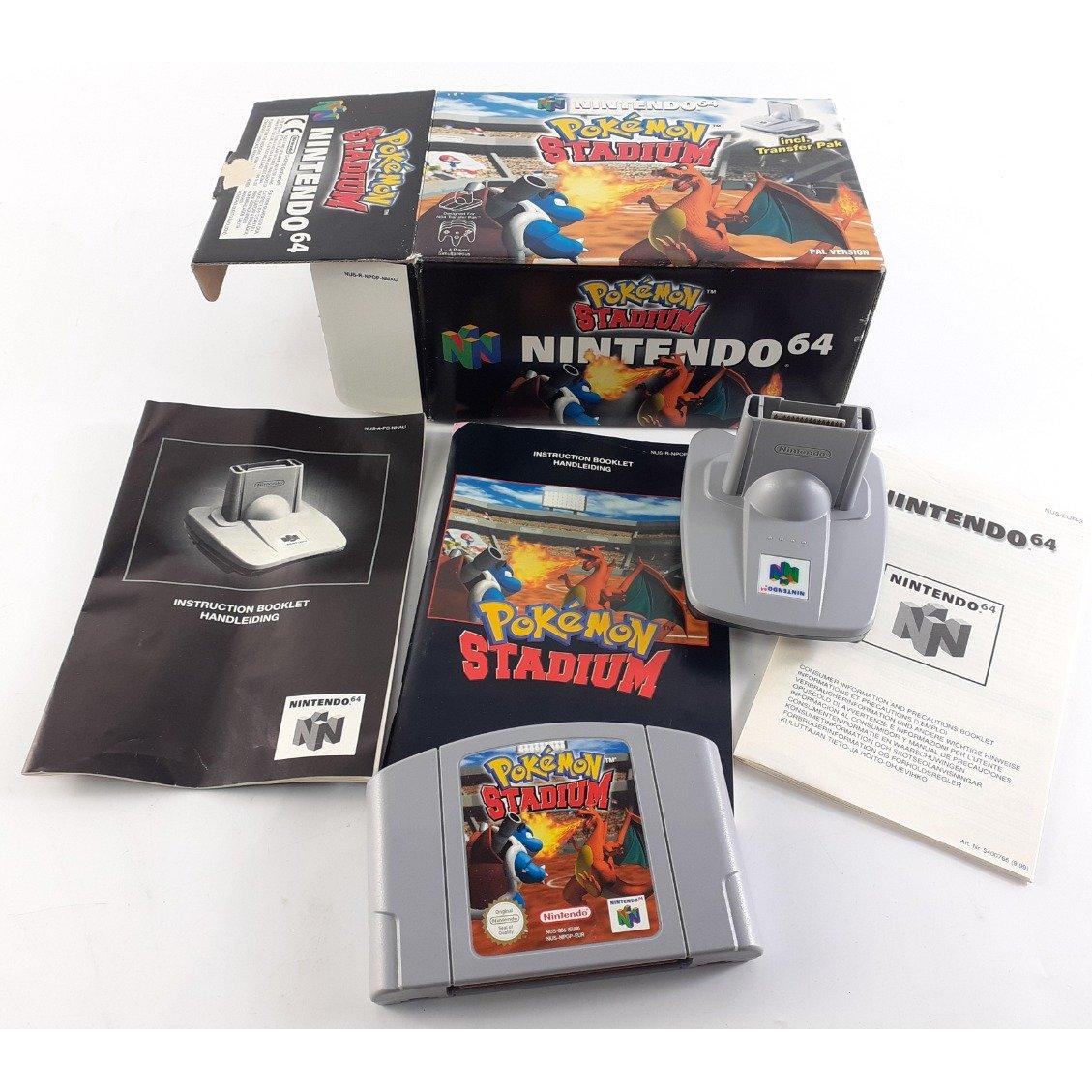 A boxed NINTENDO 64 POKEMON STADIUM including transfer pak. Includes game and instruction manuals. Box in fair condition