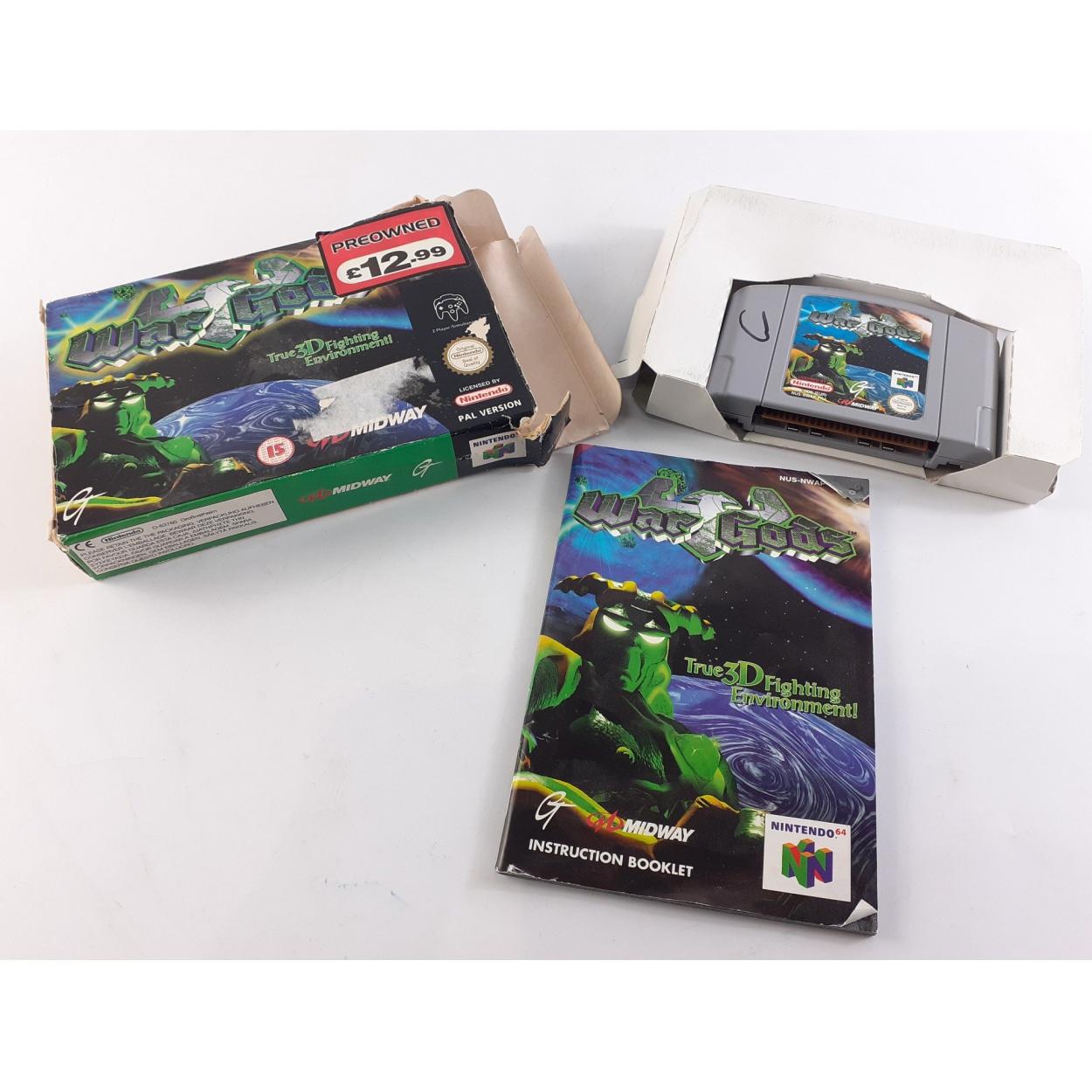 A boxed N64 WAR GODS game and instruction manual. Box has some damage.