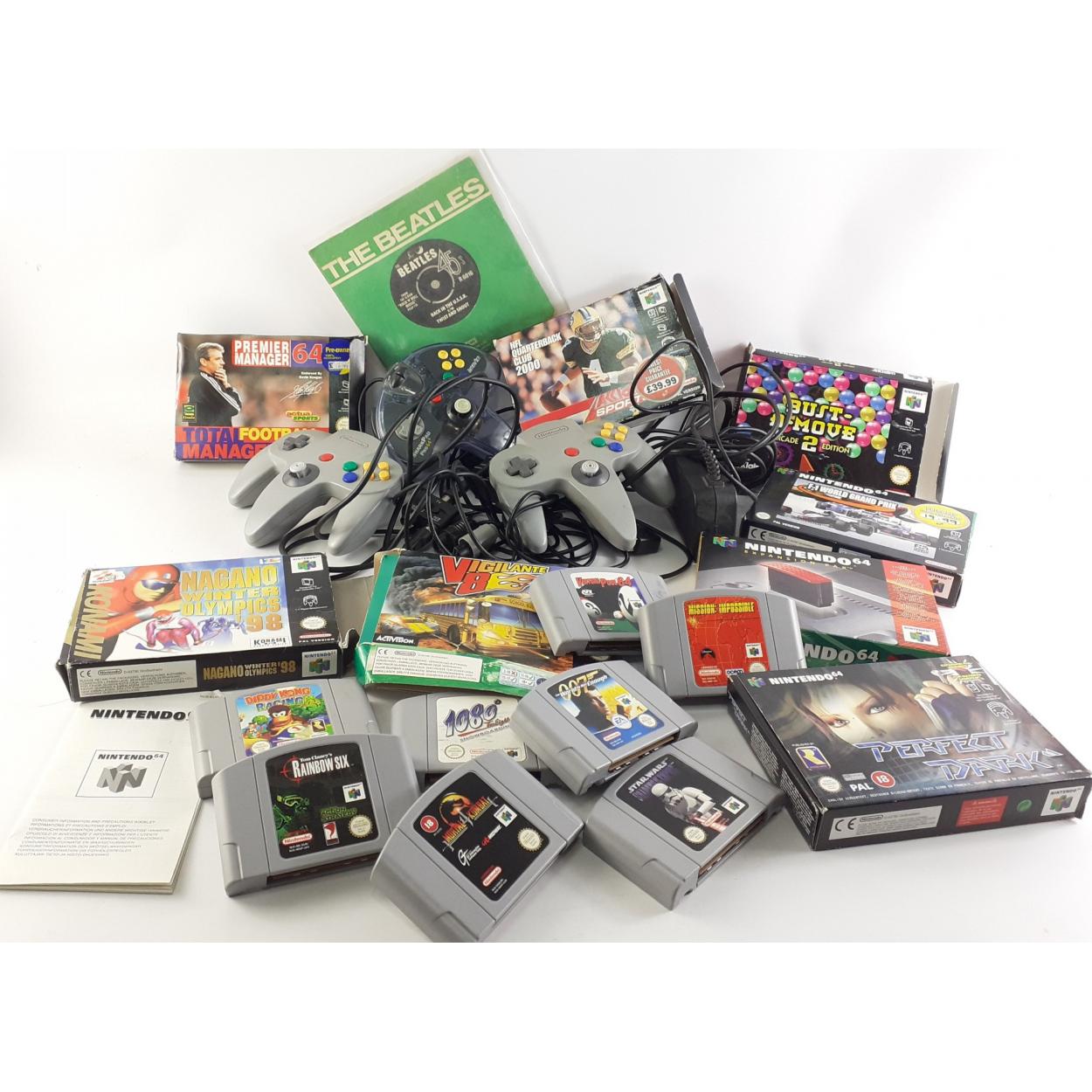 A substantial collection of controllers and NINTENDO 64 games to include PERFECT DARK, MISSION IMPOSSIBLE, STAR WARS, F1 GRAND PRIX, MORTAL KOMBAT, DIDDYKONG RACING, N64 expansion pack.