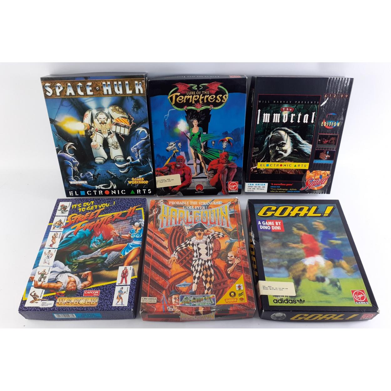 A collection of AMIGA games to include SPACEHULK, LURE OF THE TEMPTRESS, THE IMMORTAL, STREET FIGHTER II, HARLEQUIN, GOAL!