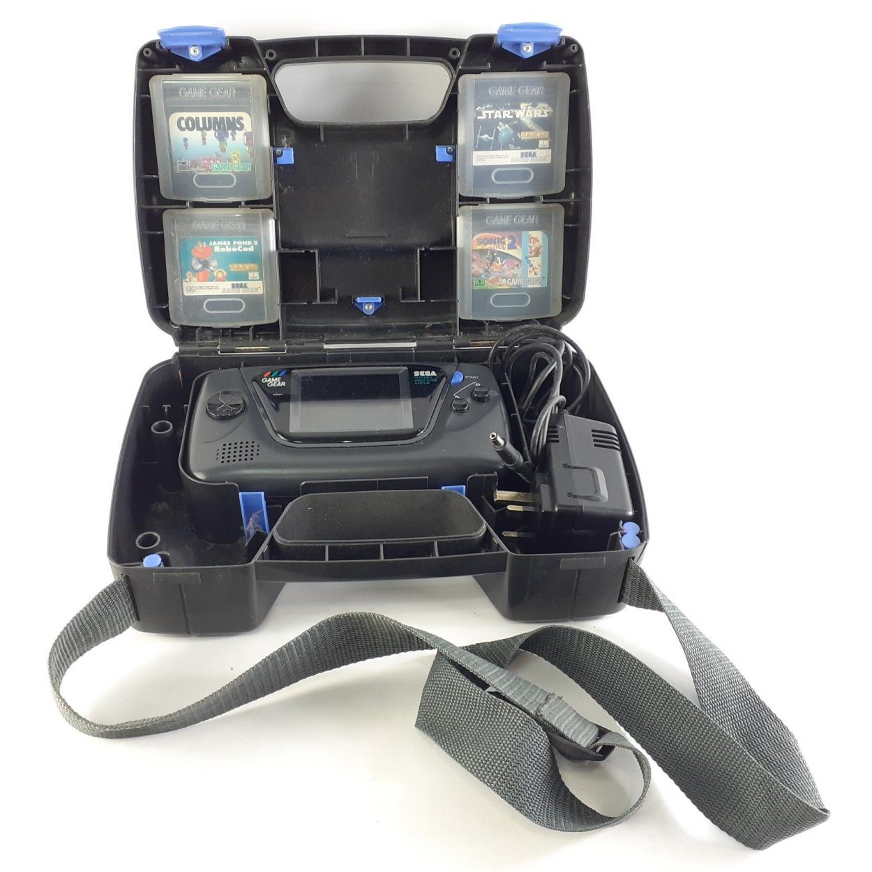 A SEGA GAME GEAR in original carry case with power adapter and games to include STAR WARS, SONIC 2, JAMES POND ROBO COD, USA WORLD CUP94 and COLUMNS. Powers up but screen does not appear to work. Easy repair in the right hands.
