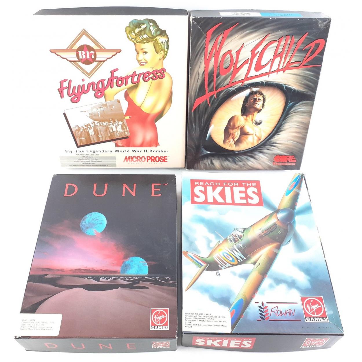 Four AMIGA games including WOLFCHILD, FLYING FORTRESS, DUNE, REACH FOR THE SKIES